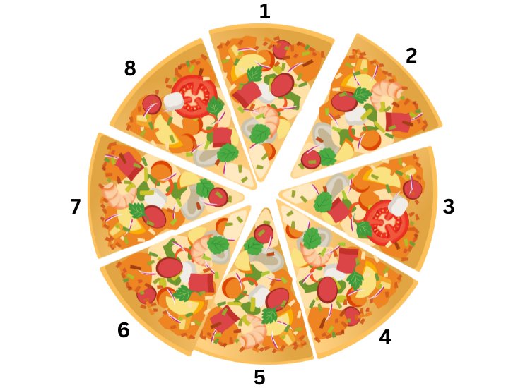 Pizza slices are created by drawing a plus (+) symbol, followed by the letter X. As a result, there will be four lines that will create eight perfectly even slices.