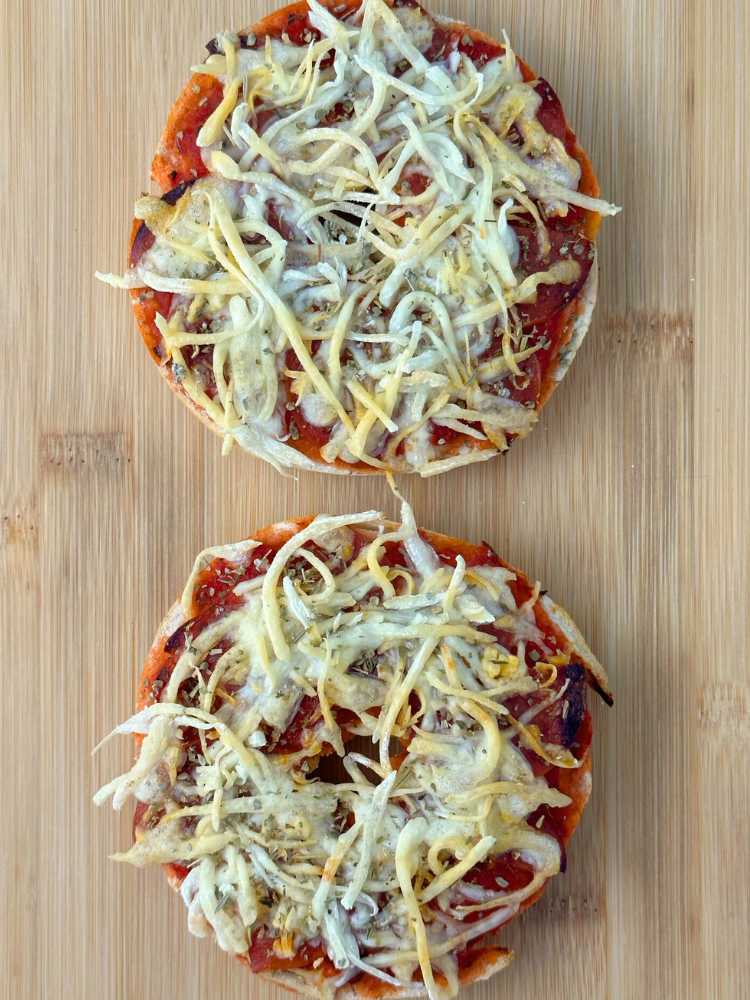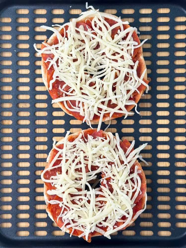 - Toppings: You can also add more toppings if you prefer. Try different blends of cheeses, meats, and veggies to make you air fryer pizza bagel one of a kind.