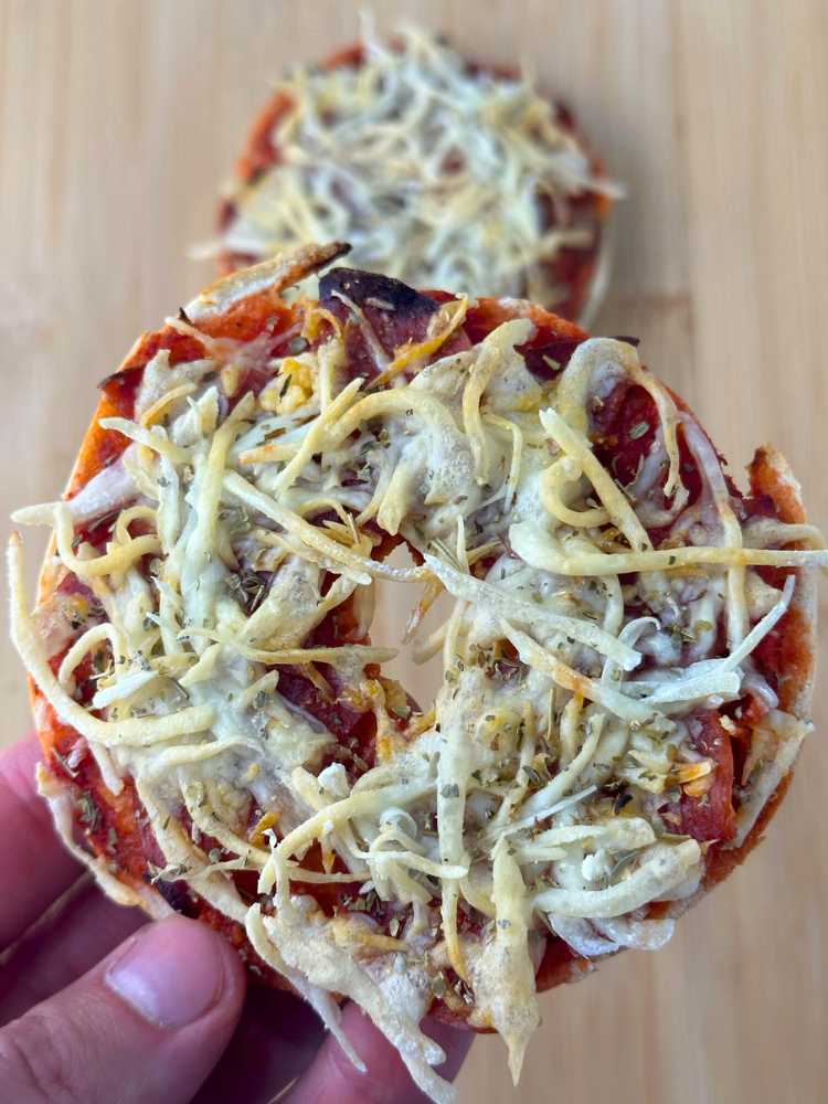 Pizza bagels taste incredible in the air fryer. They can cook much faster (compared to a toaster oven) and the cheese comes out warm and melted.