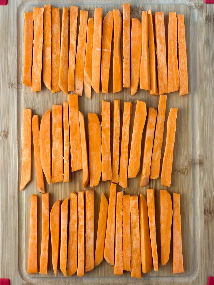 - Remove ends from sweet potatoes with a knife and cut into desired shape. I went with a more traditional longer and thinner fry.