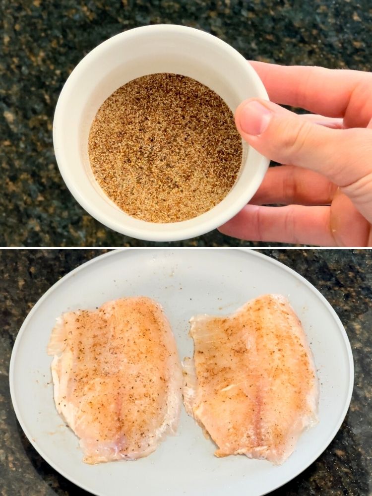 - Gently sprinkle the spices on each fillet. Make sure to flip over and coat both sides.