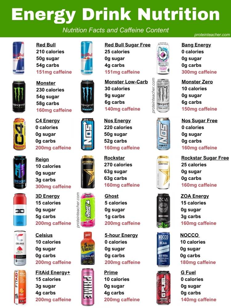 You might have noticed that many of these energy drinks contain 200 mg of caffeine – which is a lot. This number is roughly double the amount of caffeine you would find in 1 cup of coffee.