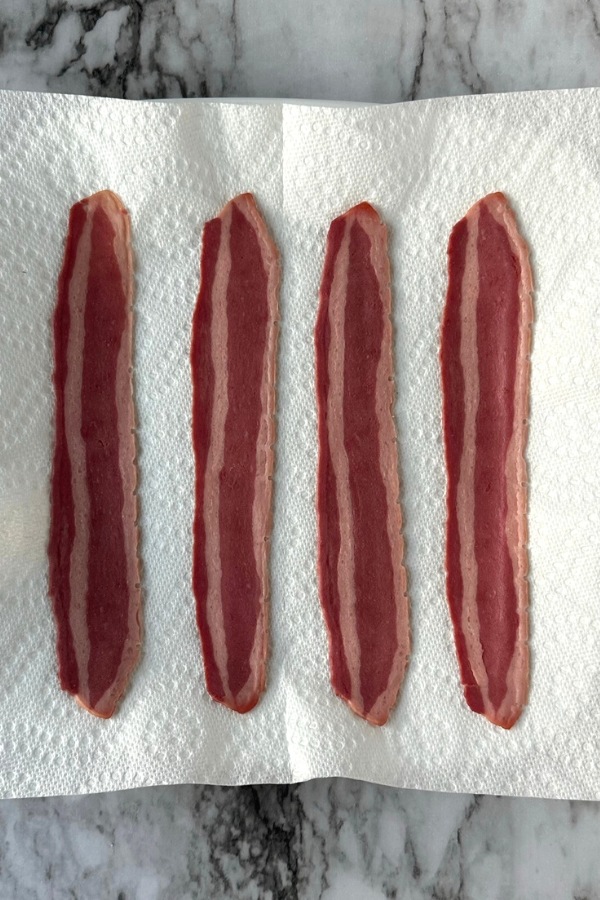- Arrange four slices of turkey bacon on the paper towels, making sure there is enough space between them.