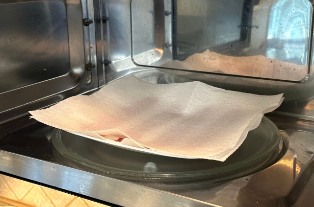 Paper towels are essential when microwaving turkey bacon. The base layer absorbs some of the fat – which helps make the slices crispy. And the top layer helps prevent splatter in your microwave.
