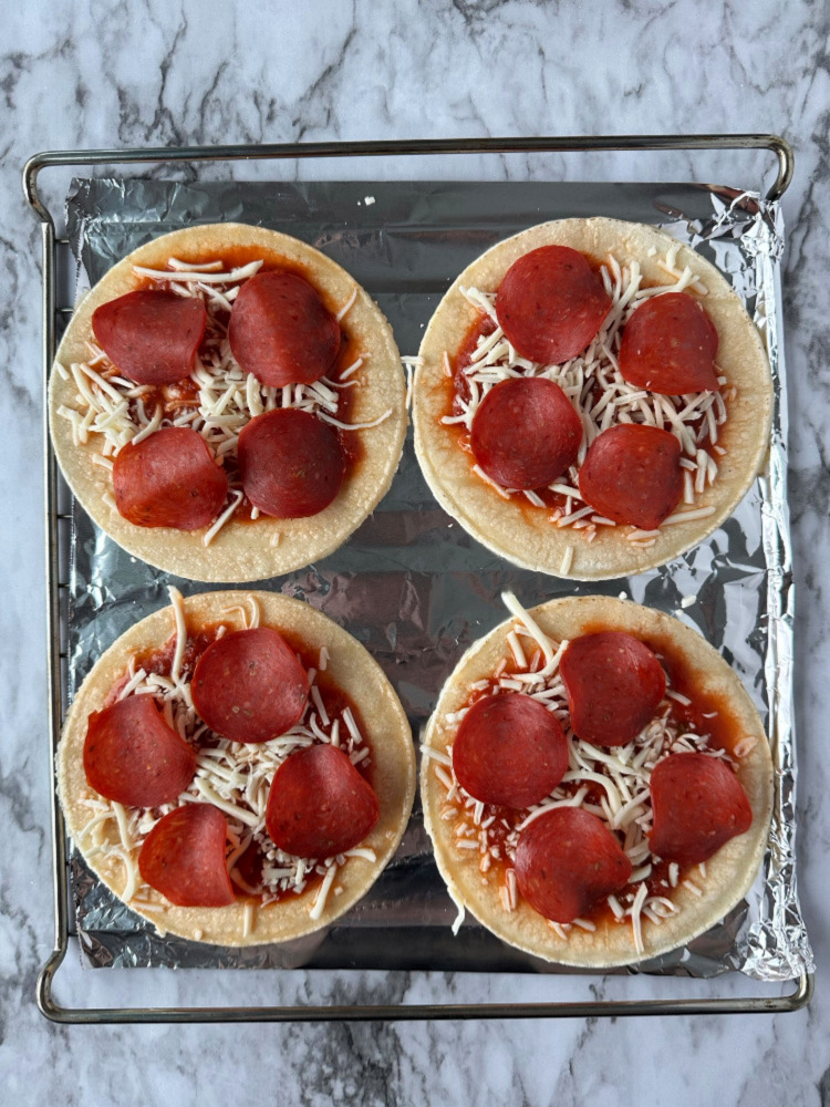 Making mini corn tortilla pizzas is so easy. Scroll down to the recipe card for more detailed instructions. Here’s an overview of the steps: