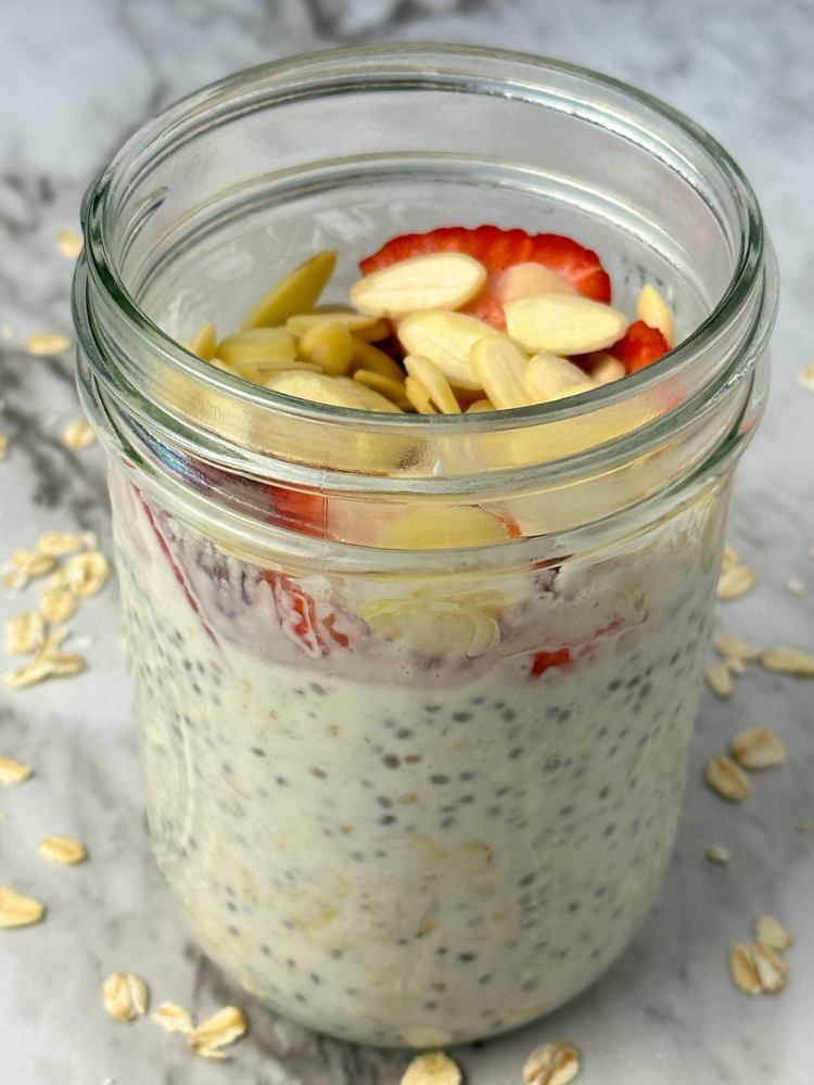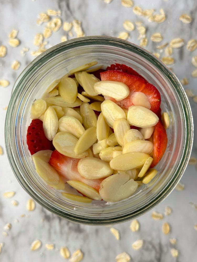 Remove the overnight oats from the refrigerator and stir once more. Then all you need to do is add fresh strawberries, sliced almonds, and whatever additional toppings you like.