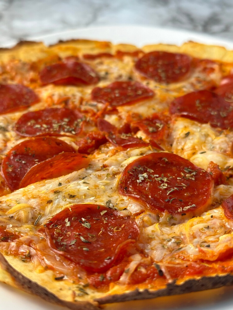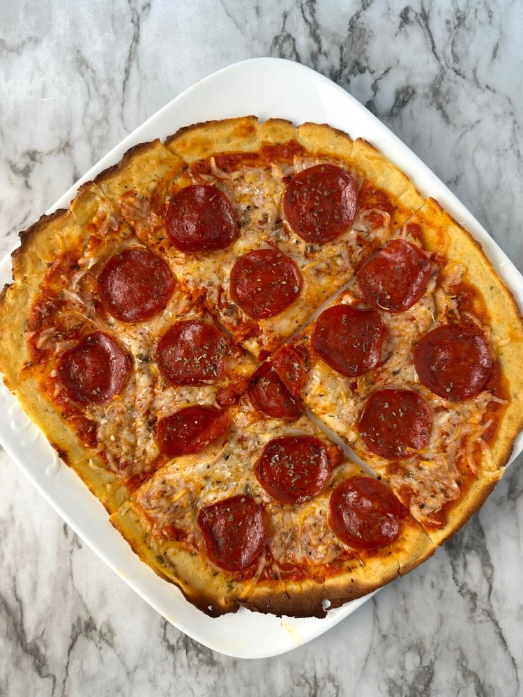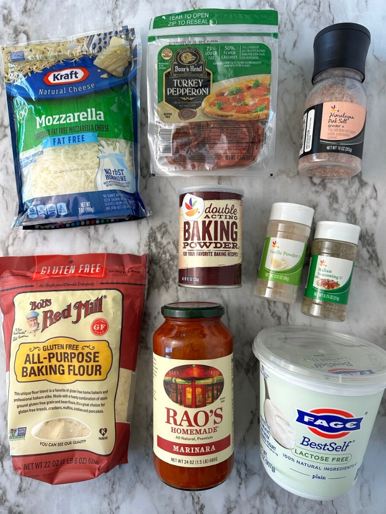 Greek yogurt, flour, and spices create a flavorful crust for all of your toppings. And once you combine fat free mozzarella cheese and turkey pepperoni, you will have a guilt-free high protein meal.