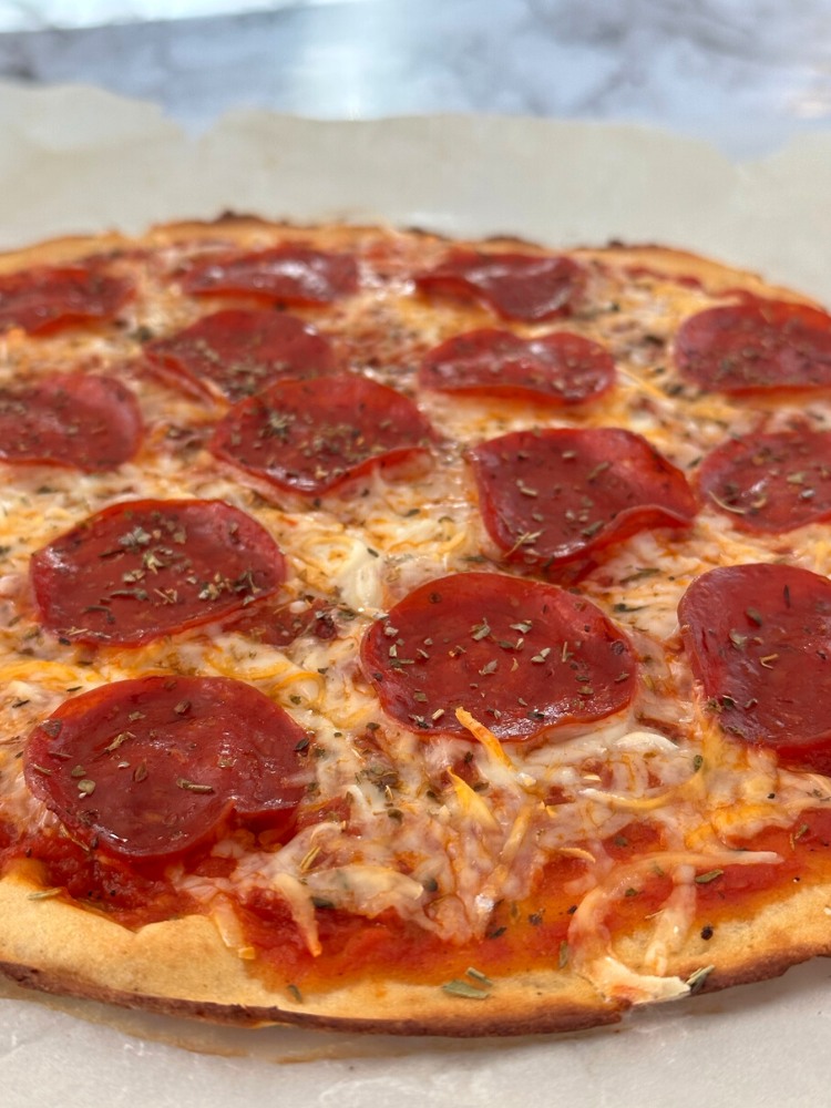 - Place the crust in the oven and cook for 5 minutes at 425° F. When finished, remove from oven and add marinara, cheese, turkey pepperoni, and Italian seasoning.