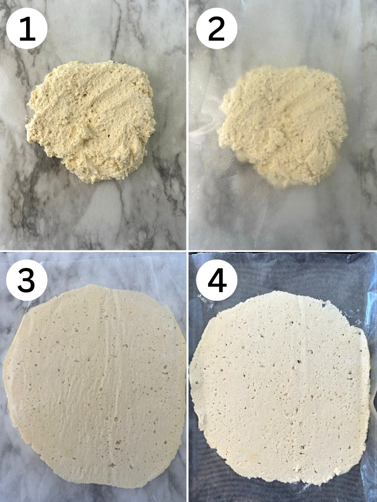 Gently run your hands over the top layer of parchment paper, spreading out the dough to form a crust. You want to avoid making the crust too thin – because it will break.