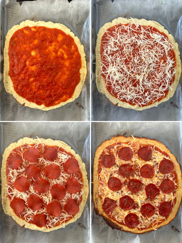 Making this protein pizza is quick and easy. You can scroll down to the recipe card for more detailed instructions. Here’s an overview of the general steps: