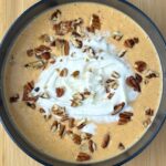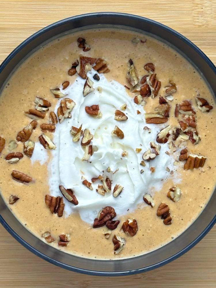 The combination of pumpkin, maple, and vanilla is perfect. Add some whipped cream, cinnamon, and chopped pecans for the ultimate breakfast (or dessert).