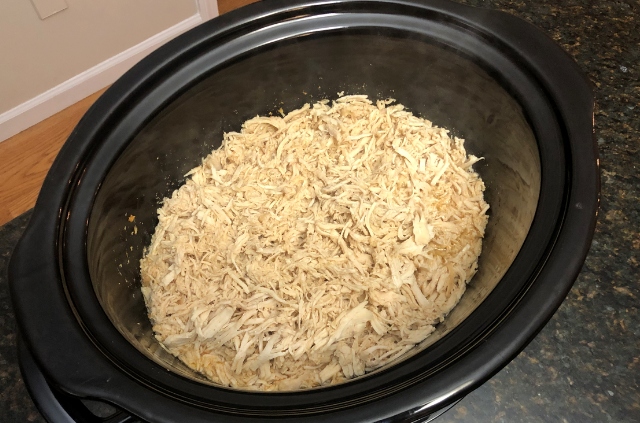 - When there is 30 minutes left, remove the lid and shred chicken. Place the lid back on until the timer is done.