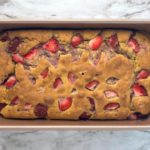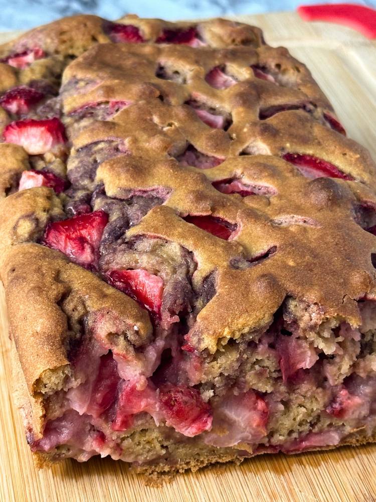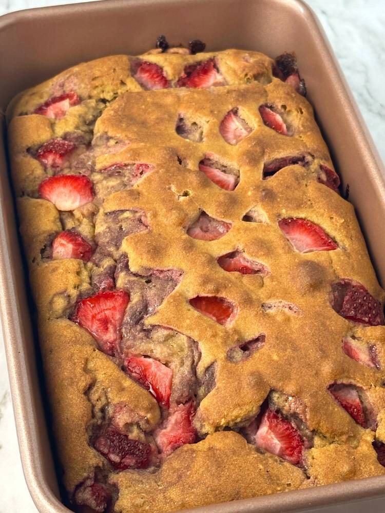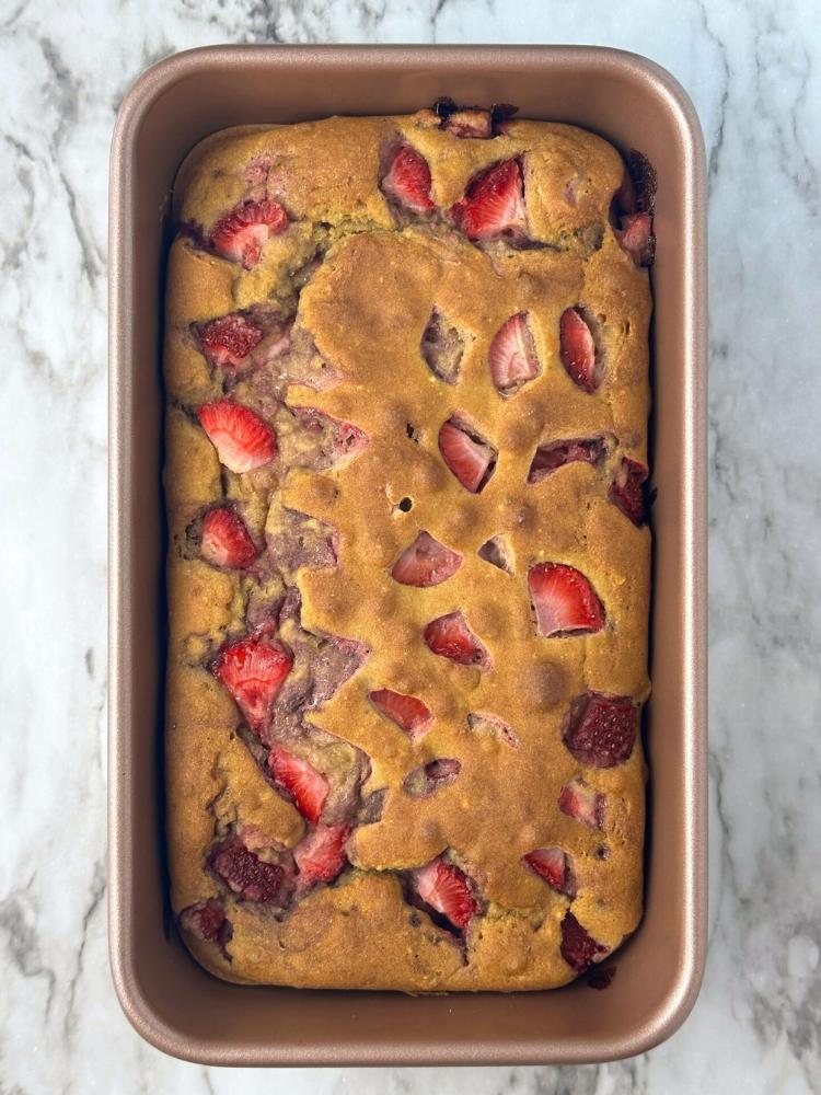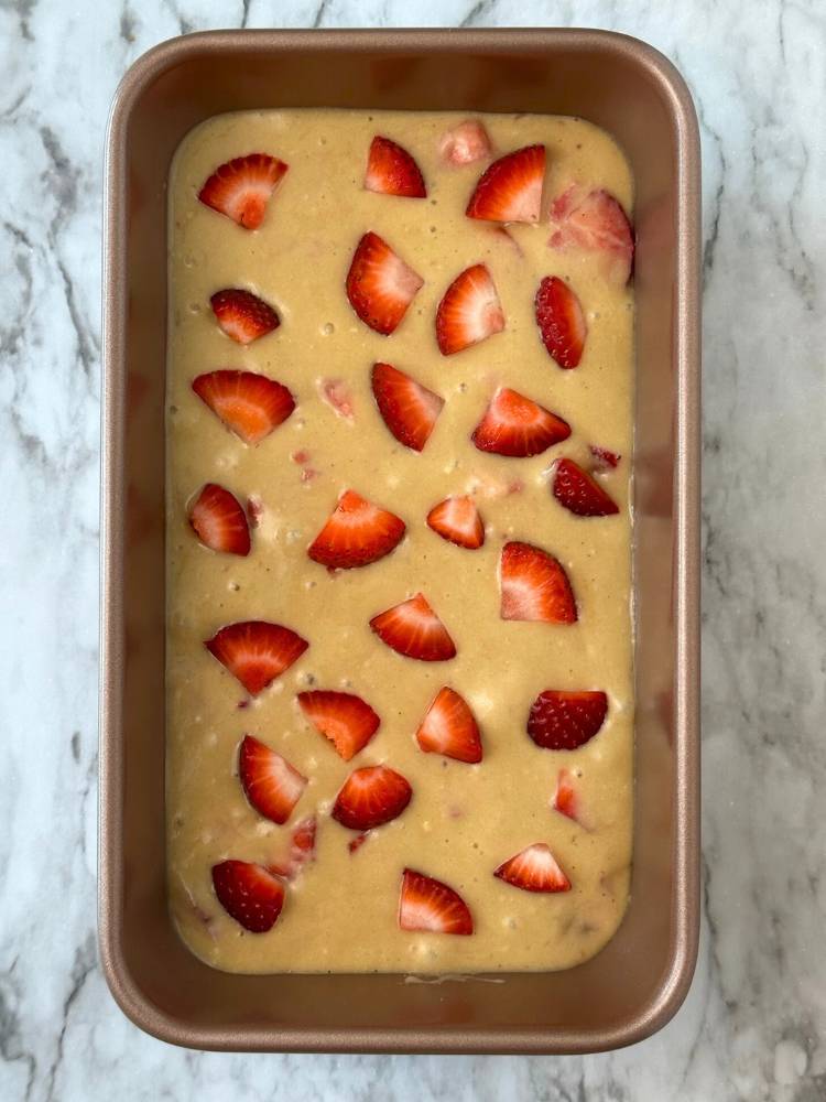 Finally, transfer the mixture to a loaf pan. Gently place the remaining 1/4 cup of strawberries on top. Bake for 40-45 minutes, or until the top turns golden brown.