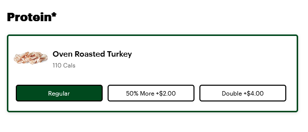 As of this writing, there are three protein options you can select when building a sub: Regular, 50% More and Double. As you might expect, the price increases when more meat is used on the sandwich.